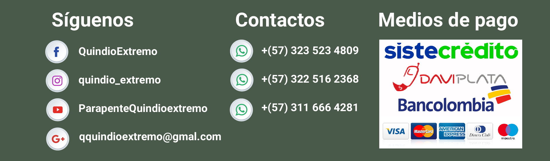Nuestro piloto SIMÓN y el favorito de la acrobacia inició en el mundo del parapente a sus 14 años, cuando un piloto perteneciente a la unión valle decidió enseñarle después de prometerle que a esto dedicaría su vida. Cuando realizó sus primeros vuelos solo y descubrió la fuerza aerodinámica y los efectos de la inercia que se sienten en el aire al realizar acrobacias, entendió que el parapente tiene un encanto mágico que es el que prefiere transmitir al pasajero a la hora de realizar la actividad de parapente por primera vez. Simón, nuestro piloto extremo tiene más de 10 años de experiencia volando en parapente tipo tándem (vuelo doble), en la Buitrera hogar (Valle), Cerrito, pie de chinche, Pradera Valle, Florida Valle, Rosas Cauca, Tacueyo Cauca, Rio Blanco Sotara, Golondrinas (Cali), Peñas negras (Cali), Roldanillo Valle, La Unión Valle, Anserma Nuevo Valle y ahora en el Quindío. Una vez desde el páramo de las hermosas en el Valle y contado cómo gran Azaña personal.
